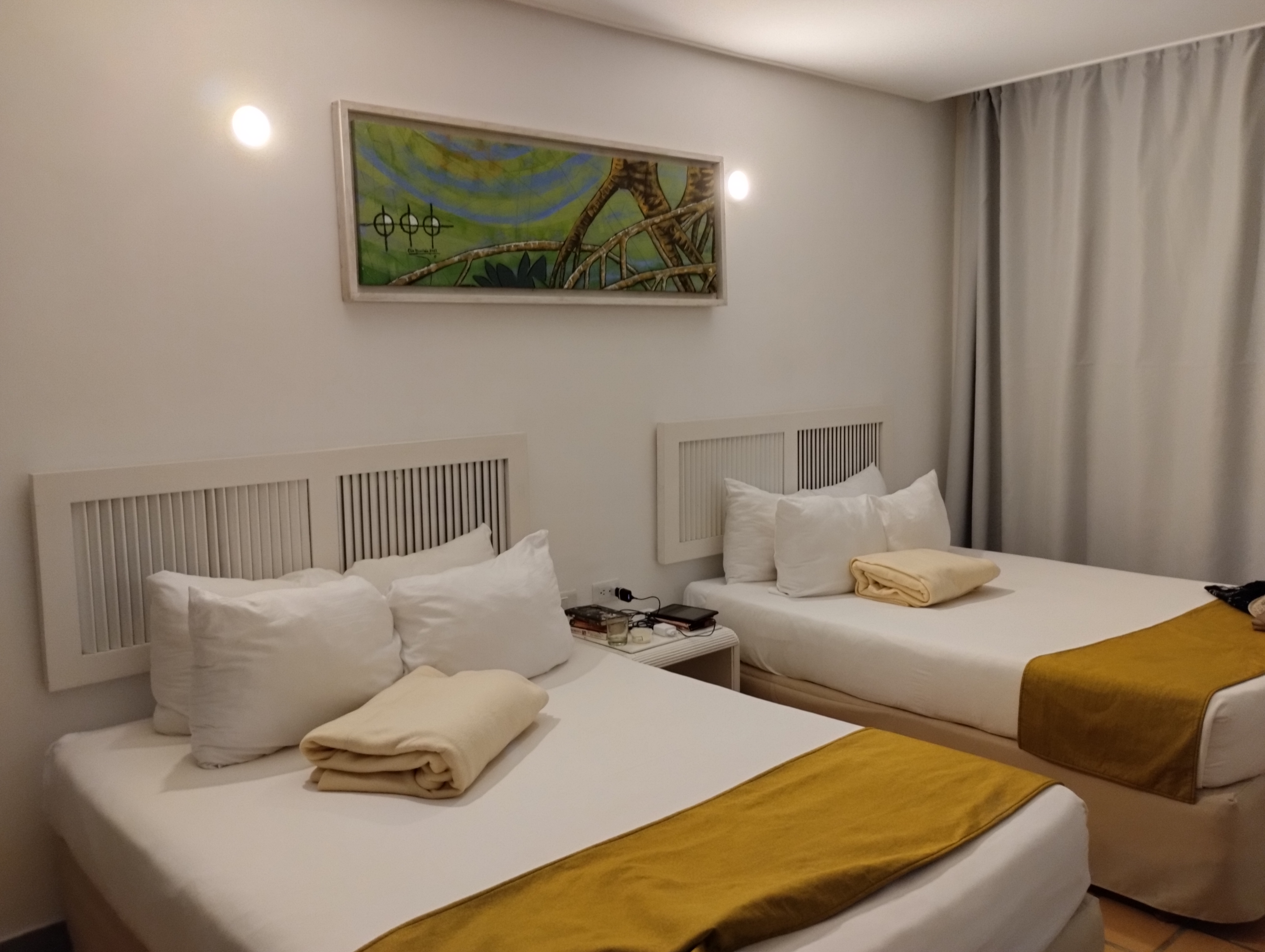 Мы выбрали отель Hesperia Isla Margarita 5*, выбирали так, что бы было "все включено" и самое главное тихую бухту, что бы поплавать...Отель прекрасный, в нем всегда останавливался Фидель Кастро, номера большие, с отдельными ванной и душем, в номере столик, кресла, вид на море...и вот тут-то начались приключения...Заселились, выпили кофейку в лобби-баре и на море. Плаваем, наслаждаемся жизнью и тут взрыв, черный дым... оказывается взорвался трансформатор!!! К вечеру при свете фонариков нас переселяли в отлеь Той же линейки Хиспериа, только 3*. Маленькое бунгало, воды горячей нет, море штормит...вот мы и поняли, когда говорили, что сервиса в Венесуэле нет...Ночью пошел дождь из канализации в душе потекла вода, номер залило, чемоданы плавали в воде, прибежали работники, полночи гоняли швабрами воду из номера в коридор...чудо как весело было. Пришлось обращаться в Москву через адвоката Интуристовского. К вечеру следующего дня нас все-таки переселили в другой отель SunSol Ecoland 4*. Вполне прилично, но только море неспокойное.