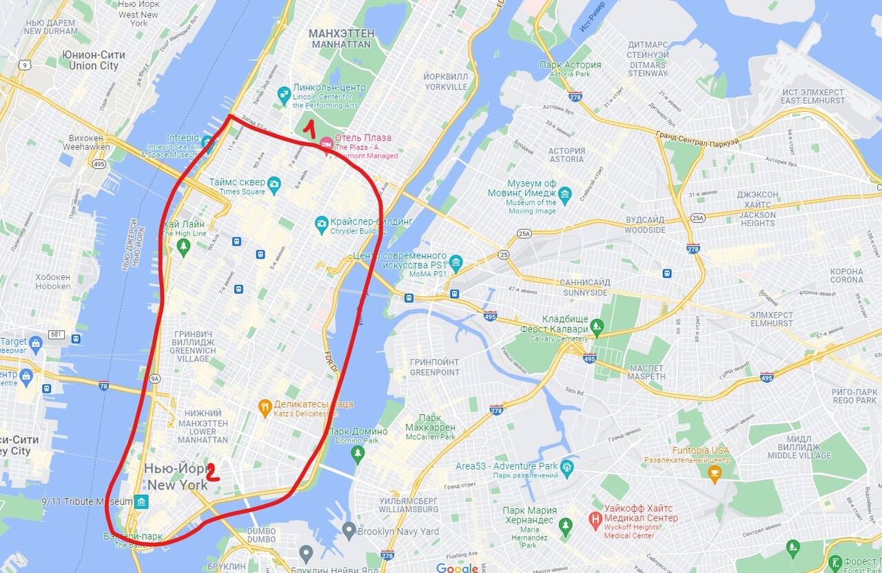 На следующей карте цифрами 1 - отмечено где я ночую, а 2 - где проходит форум. В одном из отелей в деловой зоне. А линией я обвела район, который я успею более или менее изучить, где находятся многие знаменательные места. Уже посетила 5 Авеню, Бродвей, Новый Всемирный Торговый Центр, площадь Граунд Зеро, Чайна таун, Сохо, Прошлась мимо Эмпайр Стэйт билдинг, мимо знаменитого "утюга" Флэт-айрон, погуляла по нижнему Манхэттену, в Рокфеллер-центре, побывала на Уолл-Стрит и Таймс-Сквер. Сегодня до заката (да, да... у нас разница с вами 8 часов