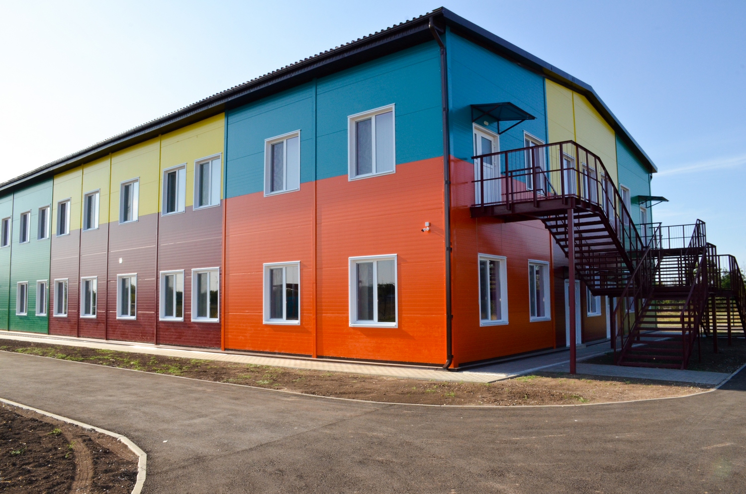 Ну, есть типовые кирпичные здания, а эти здания из блоков-модулей собираются, по типу конструктора, внутри всё как и в классическом детском саду - спальни, игровые, кухня и пр., но помещения в таком садике легко добавлять, скажем ещё одну спальню, или физкультурный зал, модули добавляют и тем самым расширяют конструкцию, они забавные на вид, блоки сделаны из металлопрофилей, покрытых огнеустойчивой краской, в итоге все эти садики разноцветные, пёстрые, высотой обычно 1-2 этажные, их монтаж и сборка дешевле, чем кап.строительство, они соответствуют всем санпинам, в них тепло, светло, уютно, я заходила в Крыму в такой, сейчас на полуострове много их запускают, да и на материке уже прилично. А ещё много модульных ФАПов и амбулаторий в сёлах.